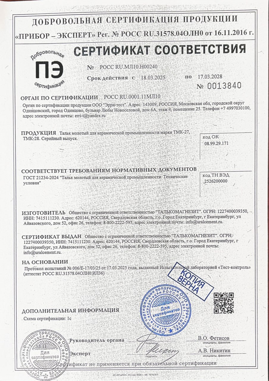 Тальк – природный минерал из класса гидросиликатов магния с химической формулой Mg₃[Si₄O₁₀](OH)₂. Это самый мягкий минерал (твердость 1 по шкале Мооса), обладающий характерным жирным или мылким ощущением при прикосновении.
